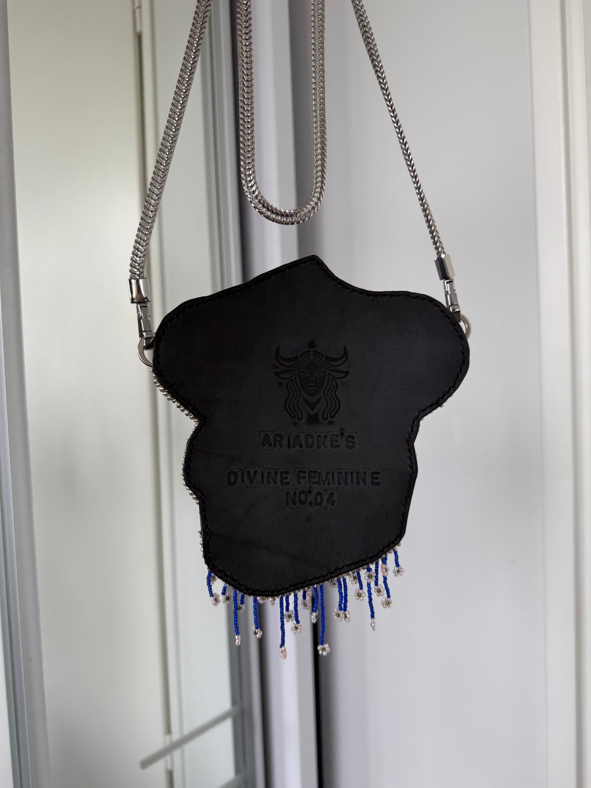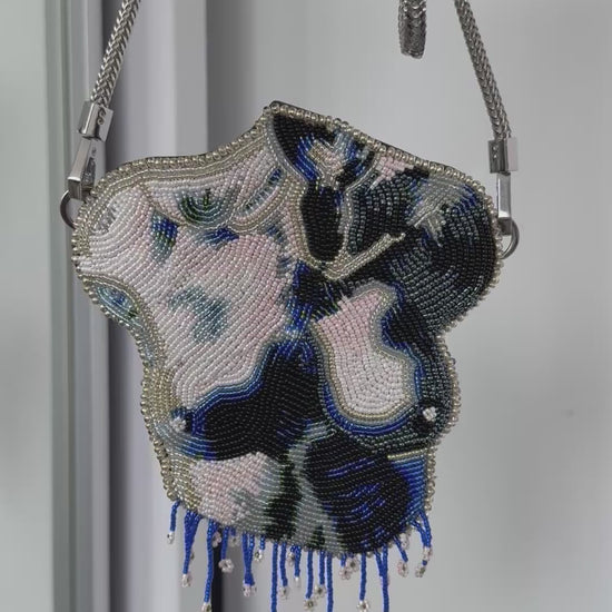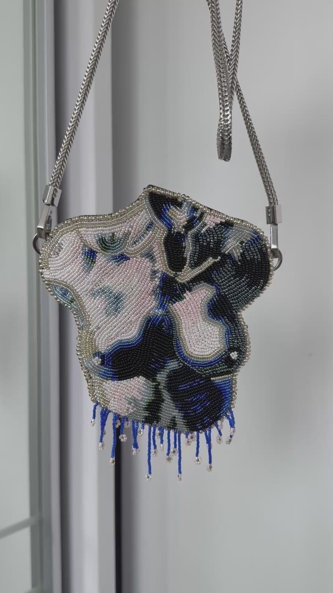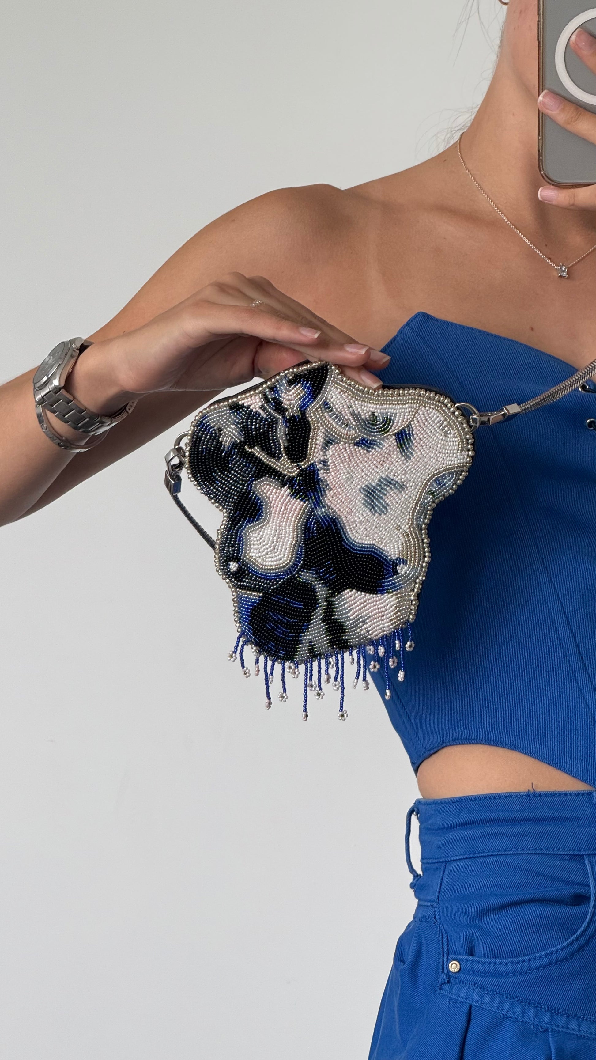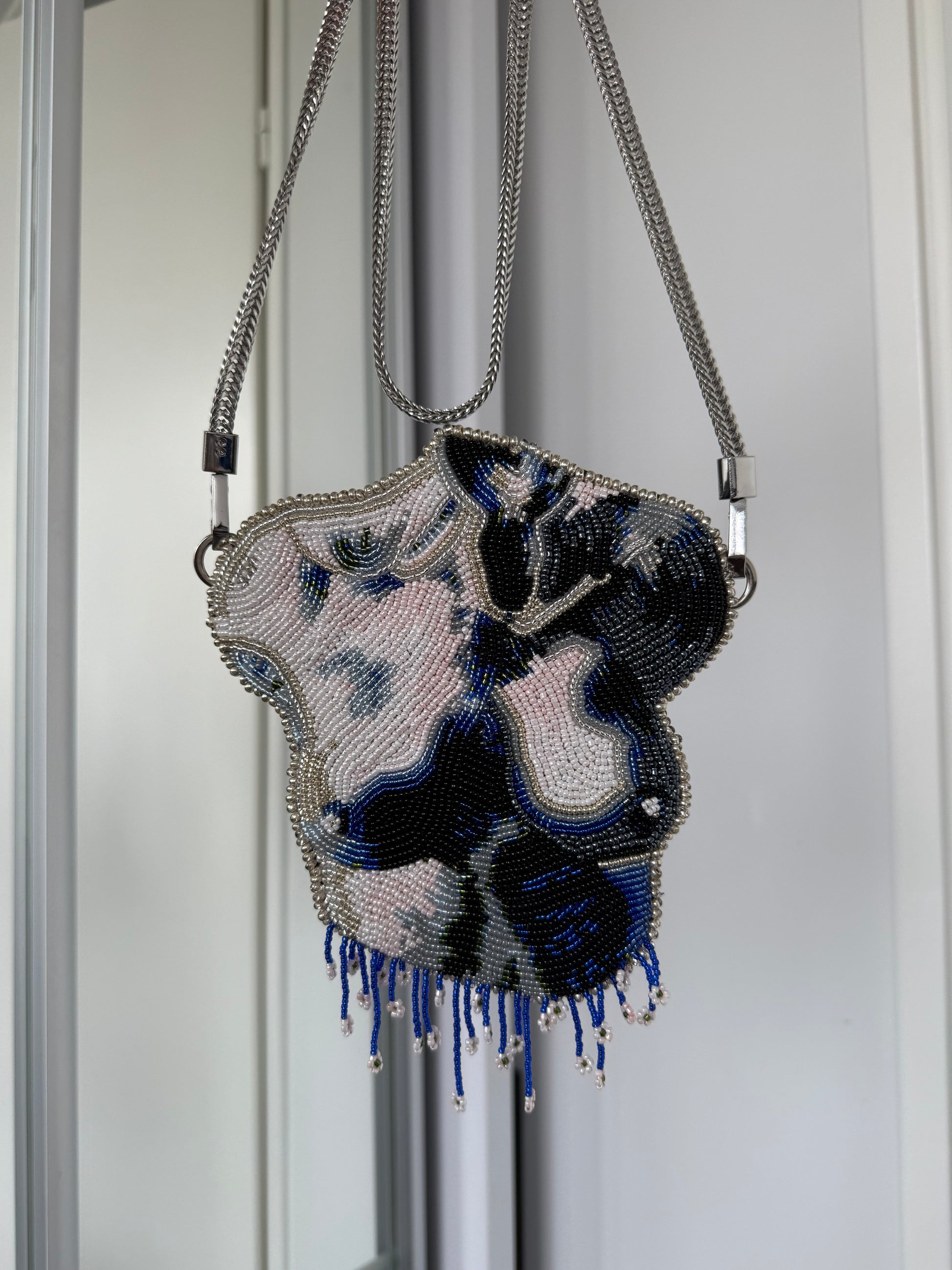 A 17 cm one-of-a-kind handbag, entirely handmade, featuring a front meticulously embroidered with 2–3 mm beads and a back crafted from genuine leather.