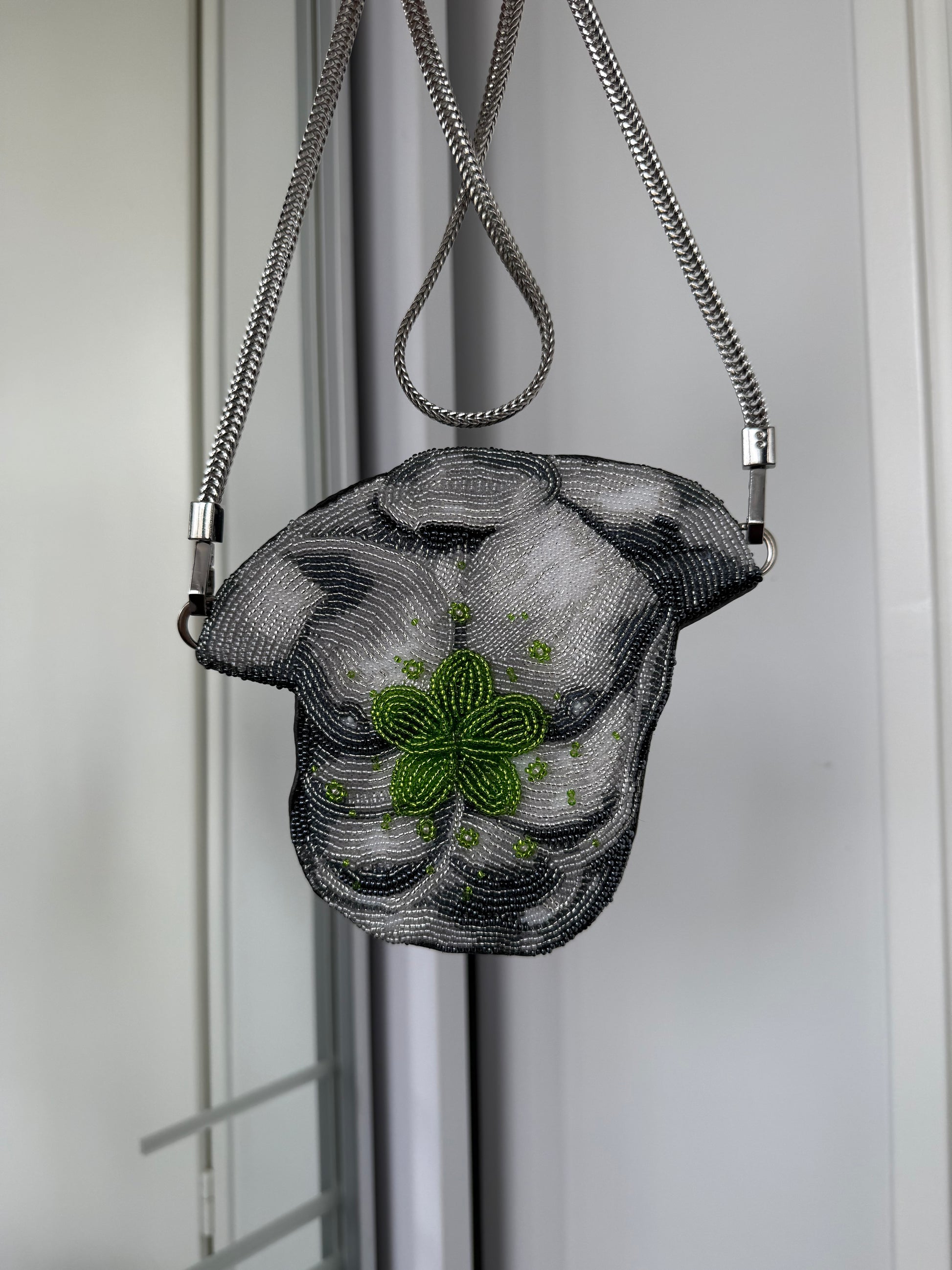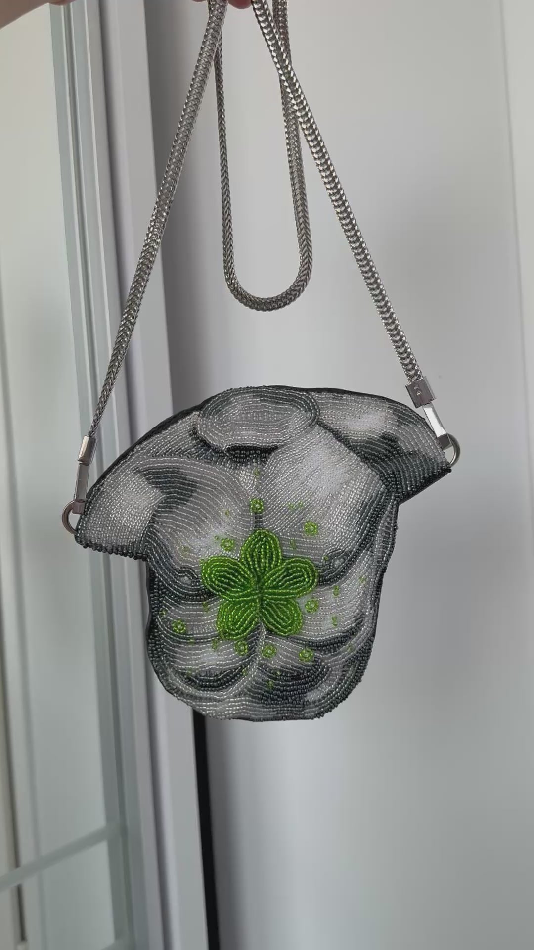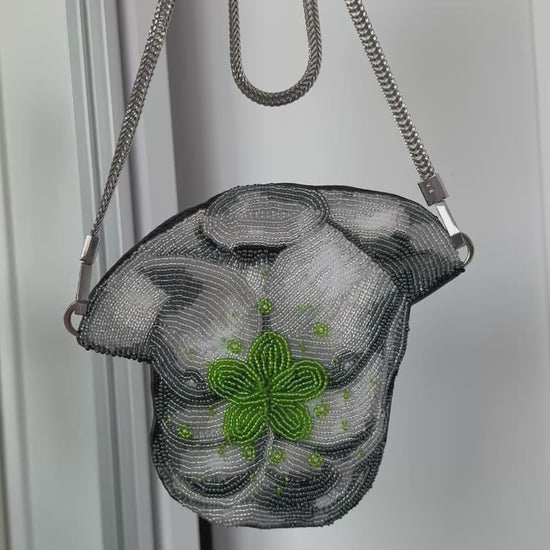 A 17 cm one-of-a-kind handbag, entirely handmade, featuring a front meticulously embroidered with 2–3 mm beads and a back crafted from genuine leather.