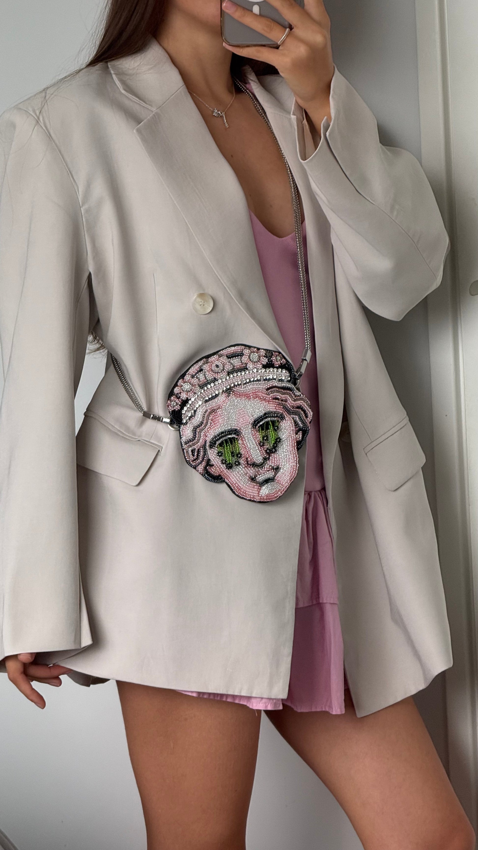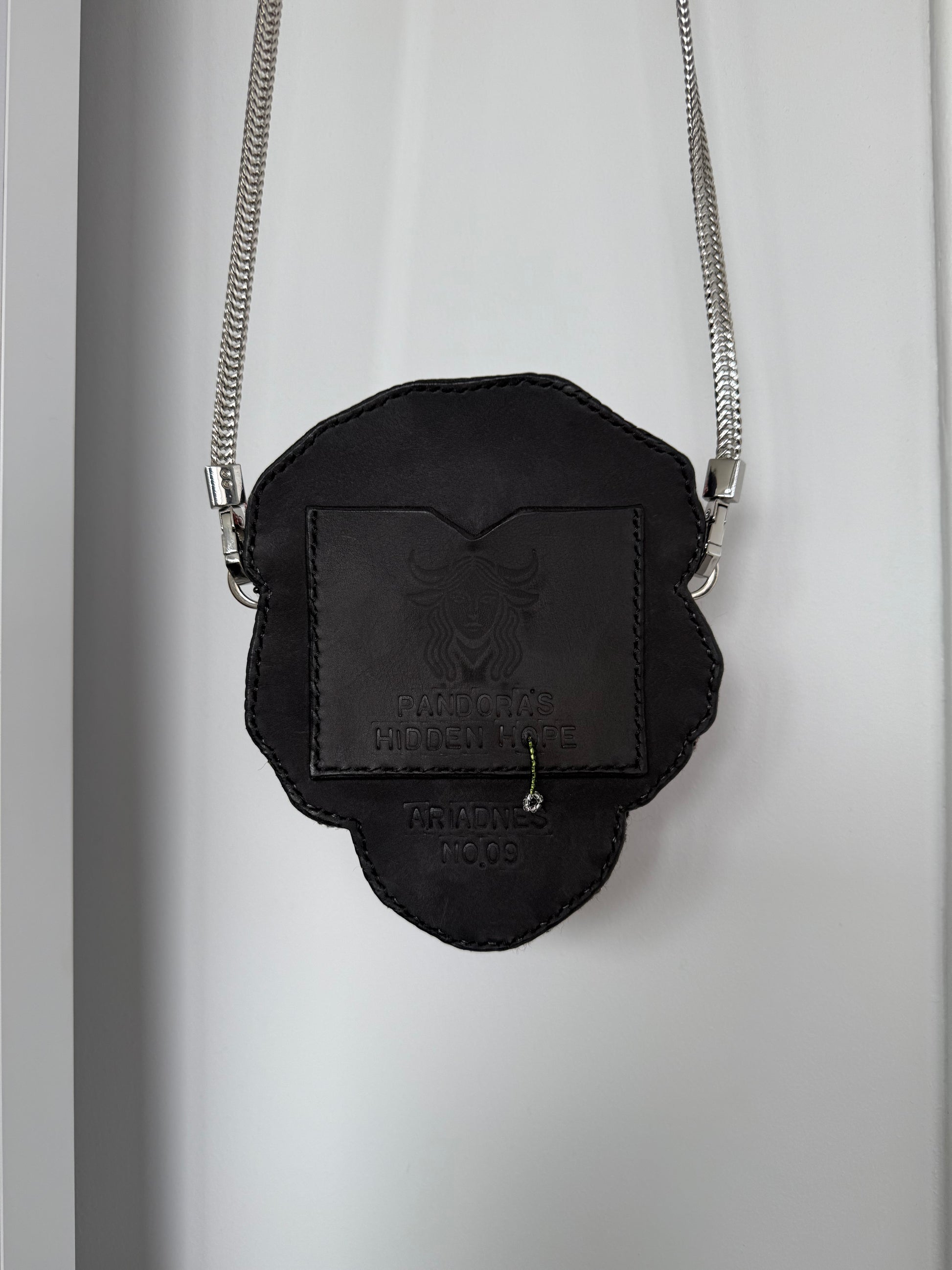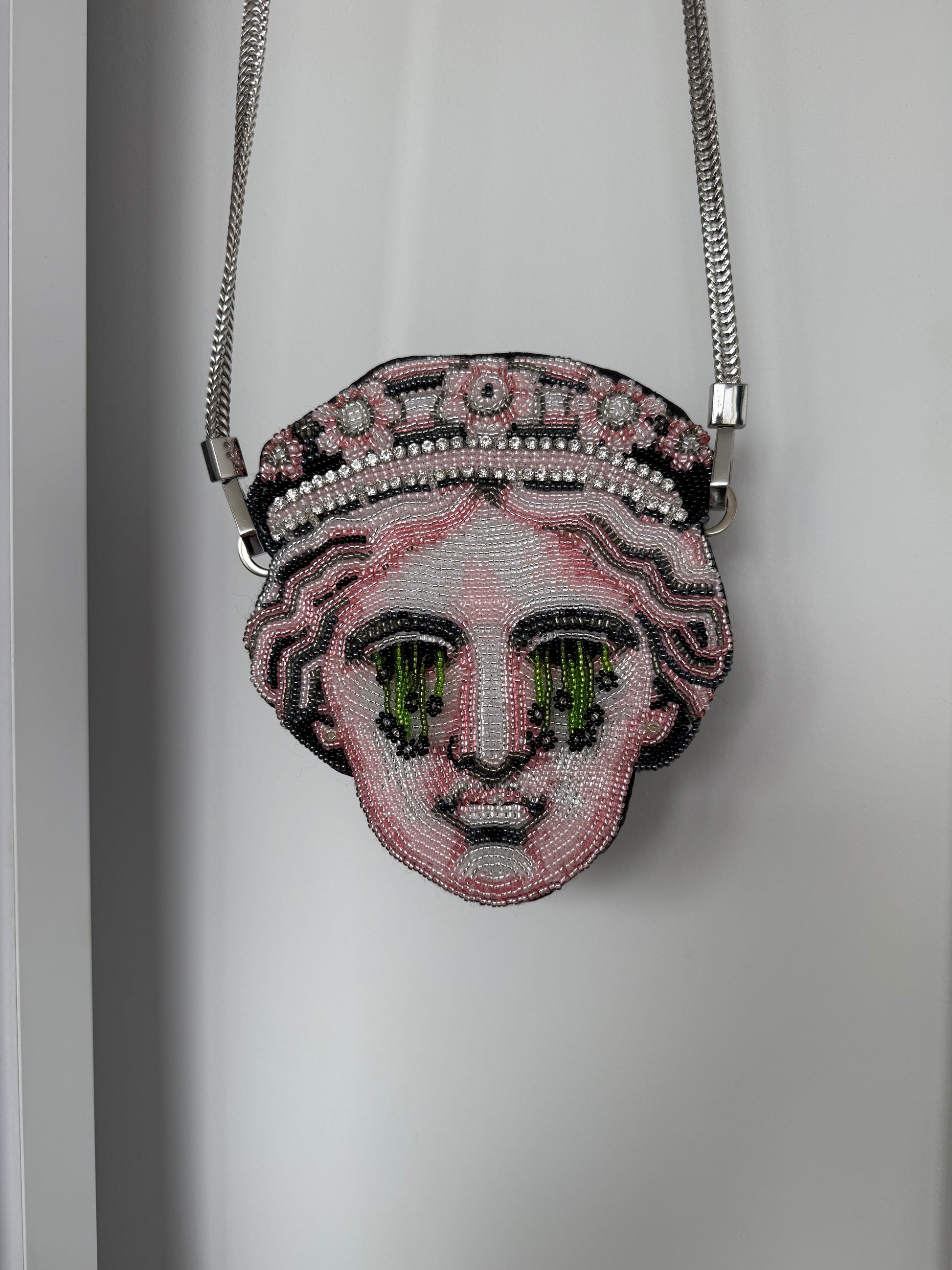 A 17 cm one-of-a-kind handbag, entirely handmade, featuring a front meticulously embroidered with 2–3 mm beads and a back crafted from genuine leather.